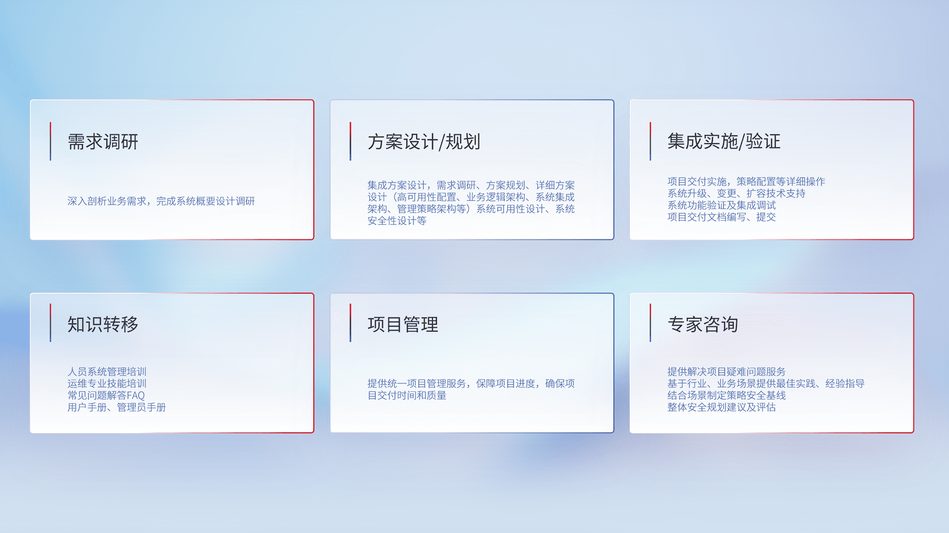 针对客户行业特性,,将宏观的安全战略和需求,,,通过专业的交付服务,,实现项目落地,,,,为客户提供标准规范的集成交付服务。。。
